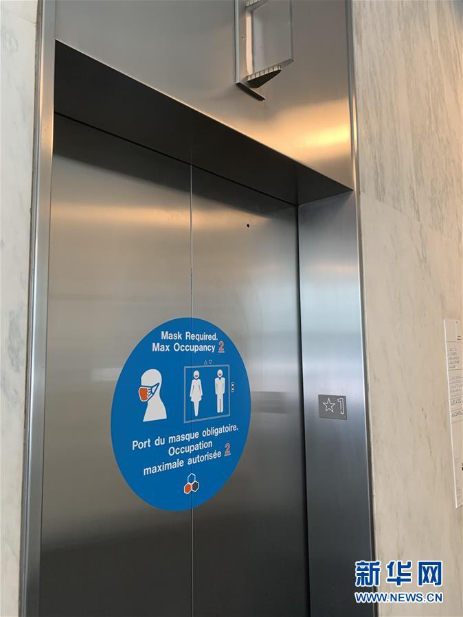 7月20日,在位于紐約的聯(lián)合國(guó)總部,電梯門(mén)上張貼著要求人們?cè)诠矆?chǎng)所佩戴口罩等標(biāo)識(shí)。受新冠疫情影響而實(shí)行遠(yuǎn)程辦公4個(gè)多月的紐約聯(lián)合國(guó)總部20日進(jìn)入重啟第一階段。按規(guī)定,該階段每天進(jìn)入總部大樓人數(shù)不能超過(guò)400人。新華社記者王建剛攝
