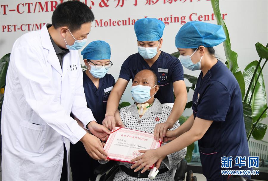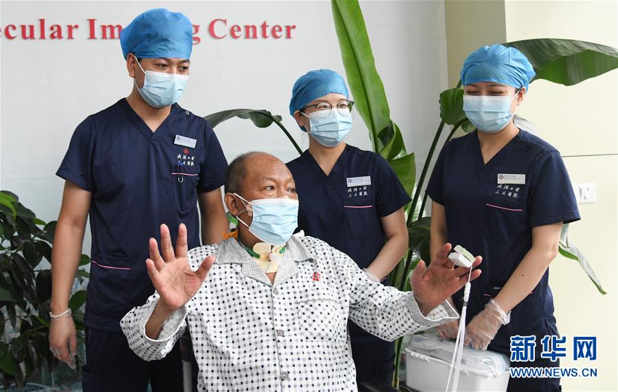 7月21日,武漢大學(xué)人民醫(yī)院醫(yī)護(hù)人員為崔先生出院做準(zhǔn)備。新華社記者程敏攝