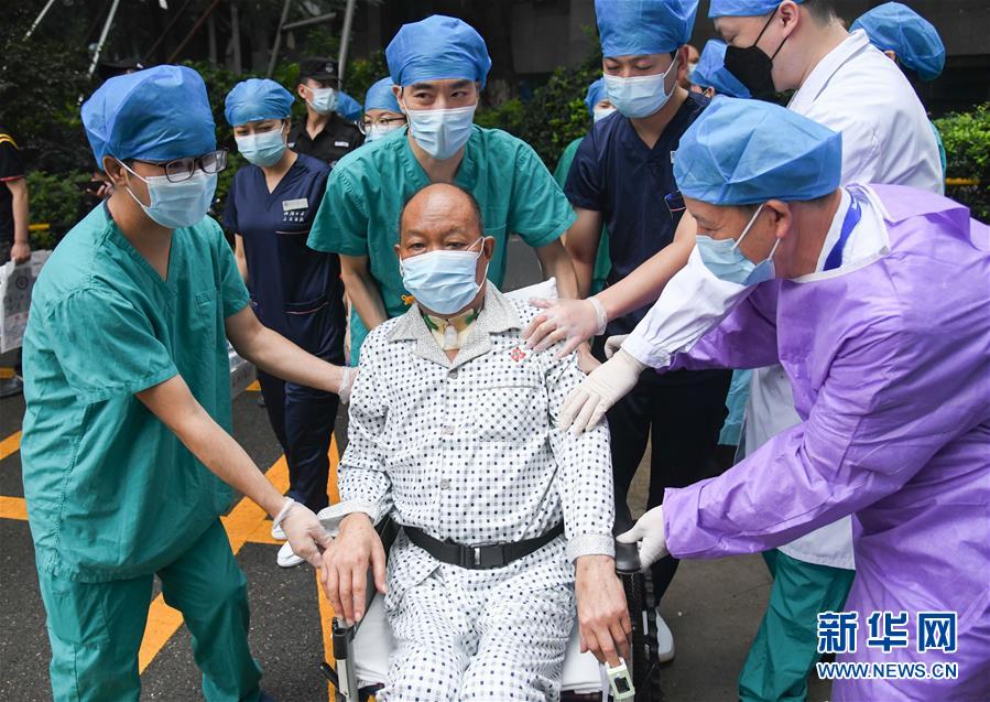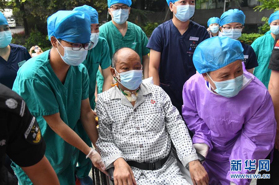 7月21日,武漢大學(xué)人民醫(yī)院醫(yī)護(hù)人員護(hù)送崔先生出院。新華社記者程敏攝