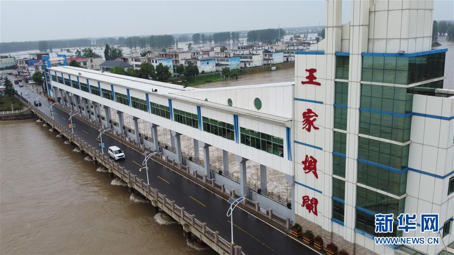 這是7月22日在安徽省阜南縣拍攝的淮河王家壩閘(無人機(jī)照片)。7月22日14時,淮河王家壩水位降至28.73米,超警戒水位1.23米,低于保證水位0.57米。新華社記者張端攝