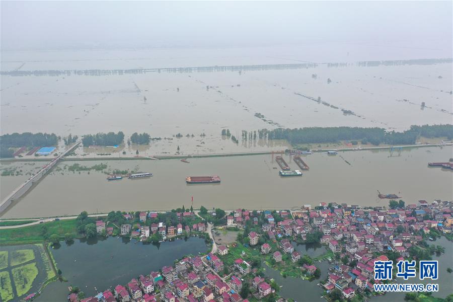 7月21日拍攝的水陽江對岸被淹的南京市高淳區(qū)陽江鎮(zhèn)勝利圩(無人機照片)。新華社記者季春鵬攝