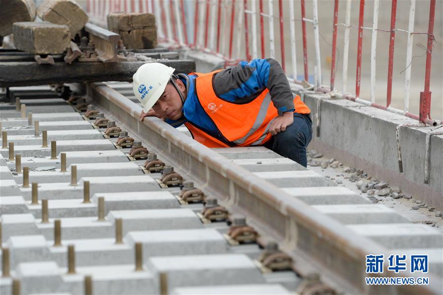 中鐵一局的施工人員在格庫(kù)鐵路新疆段查看軌排鋪設(shè)情況(7月19日攝)。新華社記者 丁磊 攝
