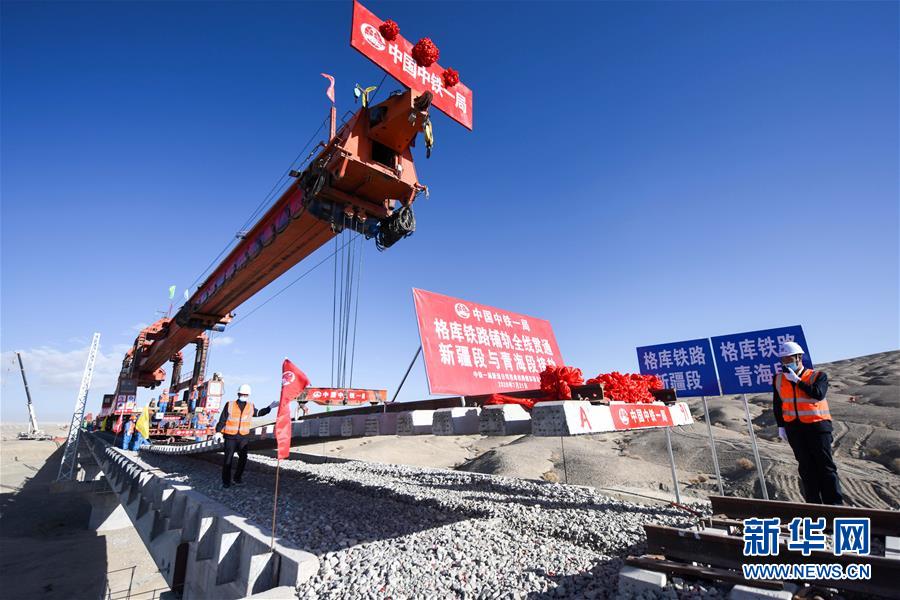 中鐵一局的施工人員在格庫(kù)鐵路新疆段鋪設(shè)最后一組軌排(7月21日攝)。新華社記者 丁磊 攝