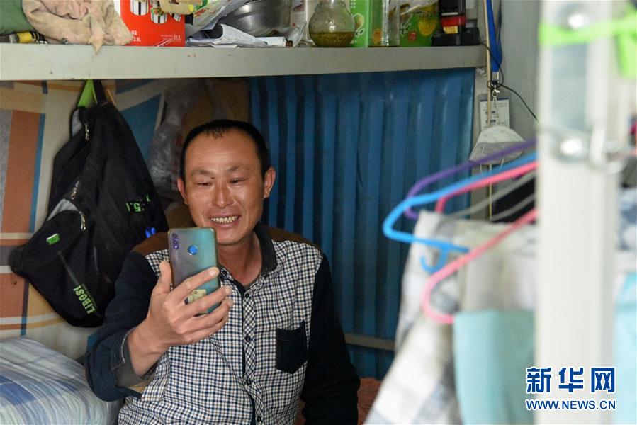 中鐵一局的施工人員在“白皮列車(chē)”內(nèi)與家人聯(lián)絡(luò)(7月19日攝)。新華社記者 丁磊 攝
