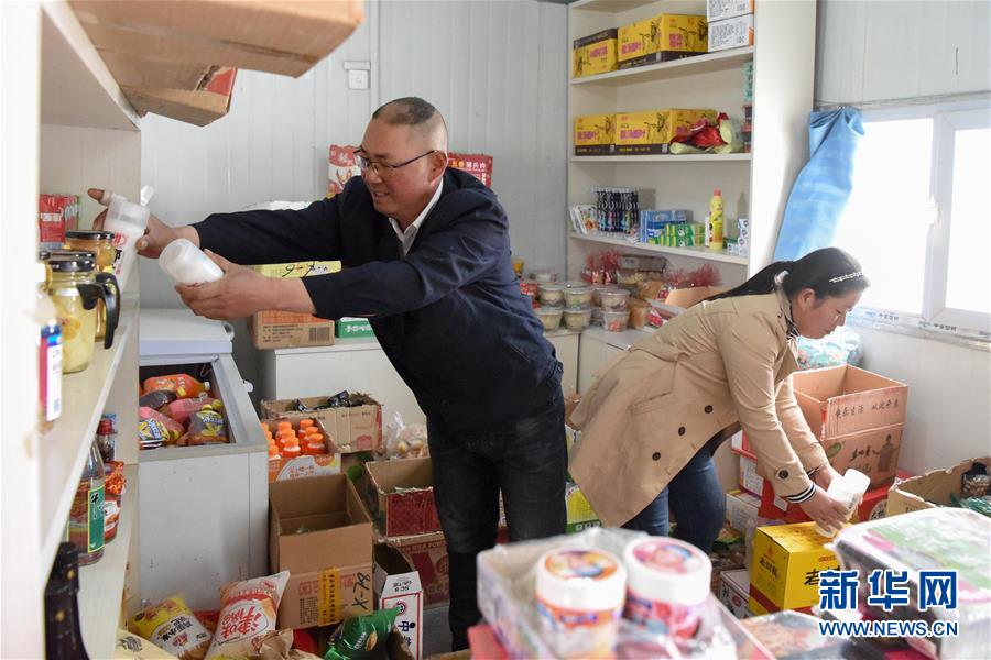 在索爾庫里宿營地,鐵路工人趙桂建(左)幫助妻子整理“白皮列車”上平價商店的商品(7月19日攝)。新華社記者 丁磊 攝