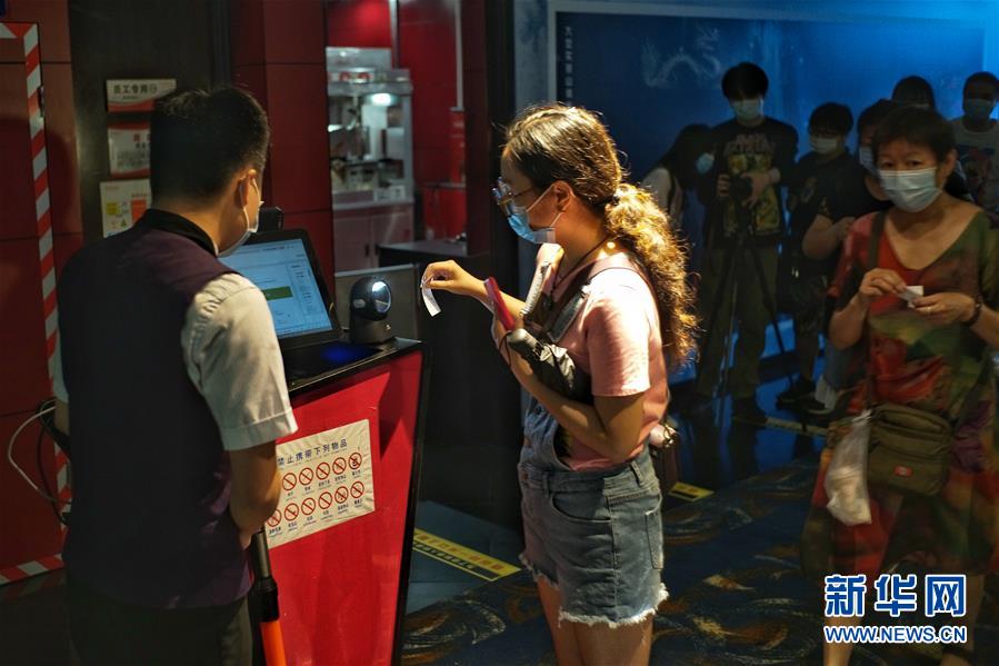 7月24日,在首都電影院(西單店),市民排隊驗票進入影廳。當日,在做好新冠肺炎疫情防控的前提下,北京市部分電影院有序恢復(fù)開放。新華社記者 彭子洋 攝