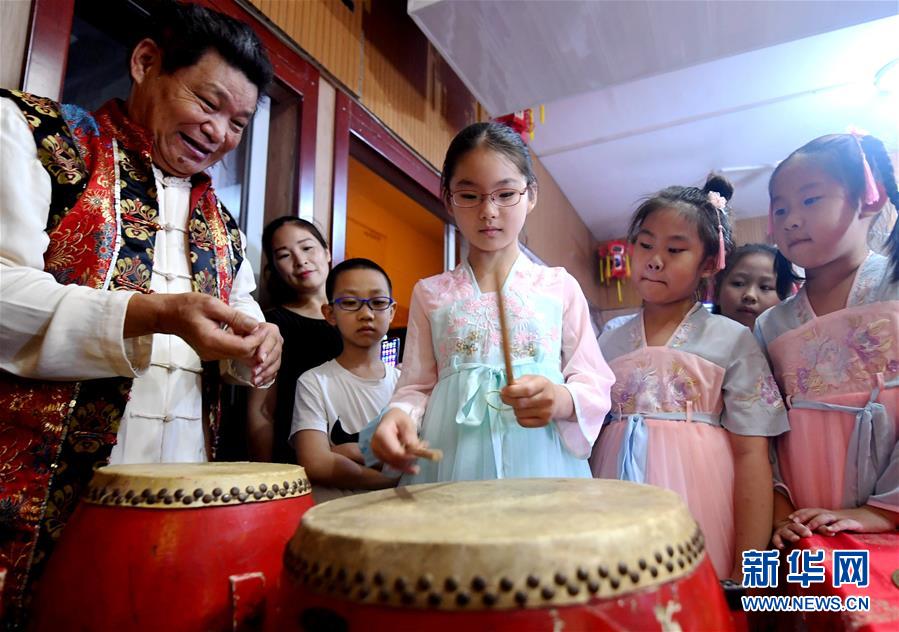 7月26日,在石家莊市橋西區(qū)休門街道休門西街社區(qū),休門吹歌傳承人付錫芬(左一)在指導(dǎo)小朋友敲鼓技巧。當(dāng)日,河北省石家莊市橋西區(qū)暑期“非遺”小課堂開班。河北省級非物質(zhì)文化遺產(chǎn)休門吹歌傳承人走進(jìn)休門街道休門西街社區(qū),為轄區(qū)小朋友講解休門吹歌歷史,傳授非遺技藝,豐富他們的暑期生活。新華社記者 王曉 攝