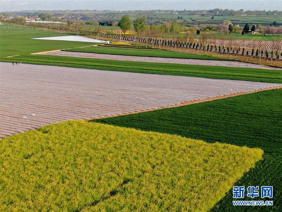 這是洛陽市洛寧縣小界鄉(xiāng)一處油菜、西瓜、小麥間種的農(nóng)田(4月13日攝,無人機(jī)照片)。新華社記者 李安 攝