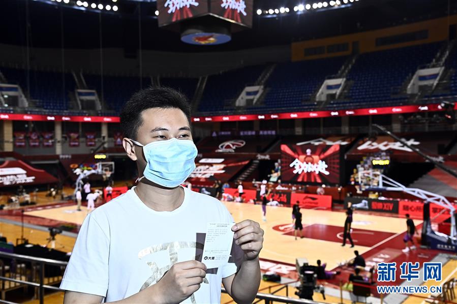 7月26日,在青島國信體育館,蘇柯帆展示著自己的紙質(zhì)球票。他成為CBA聯(lián)賽復(fù)賽允許觀眾現(xiàn)場觀賽后,首位進(jìn)場的觀眾。當(dāng)日,在山東青島舉行的2019-2020賽季中國男子籃球職業(yè)聯(lián)賽(CBA)復(fù)賽第二階段(嶗山賽區(qū))比賽中,醫(yī)護(hù)人員、教師、公安戰(zhàn)線人士通過官方購票平臺,完成包括核酸檢測在內(nèi)的相關(guān)流程后進(jìn)場觀看了上海久事隊(duì)迎戰(zhàn)山東西王隊(duì)的比賽。觀賽期間,觀賽者須全程佩戴口罩,對號入座,嚴(yán)格保持間隔一米就座。退場時(shí),觀眾須按照自后向前、先兩邊后中間的順序,保持“一米線”社交距離有序退場。新華社記者 郭緒雷 攝