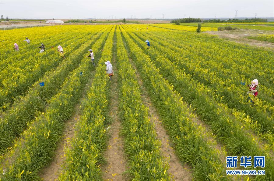 村民在寧夏紅寺堡區(qū)柳泉鄉(xiāng)柳泉村采摘黃花菜(7月11日攝,無人機照片)。新華社記者 楊植森 攝