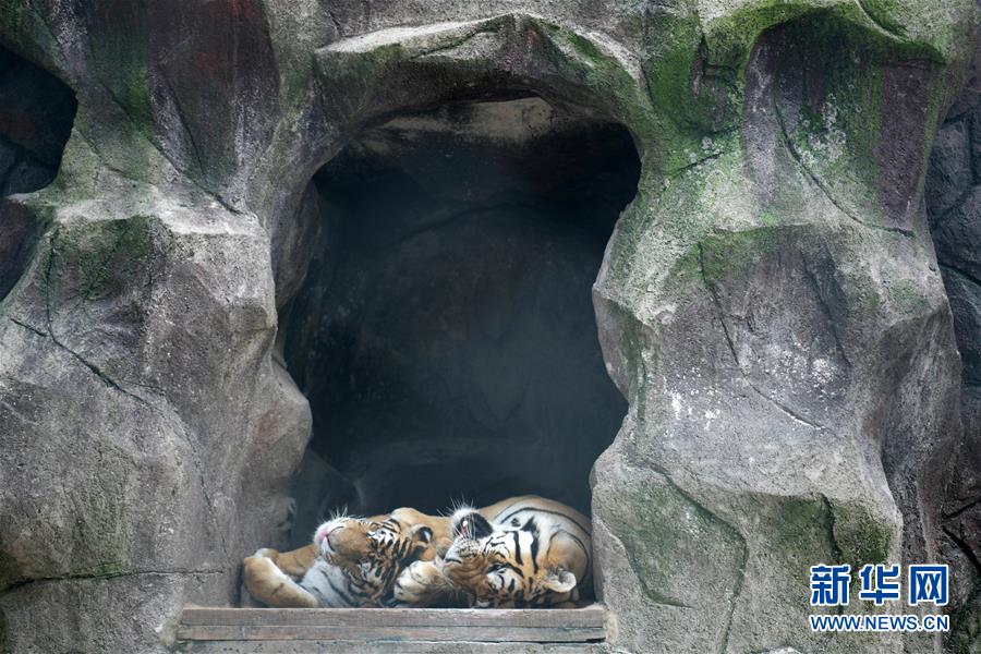 在橫道河子?xùn)|北虎林園,東北虎在休息(7月27日攝)。時(shí)值盛夏,位于黑龍江省海林市的橫道河子?xùn)|北虎林園的東北虎活動量減少,以不同方式消夏納涼。新華社記者王建威攝