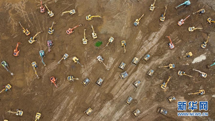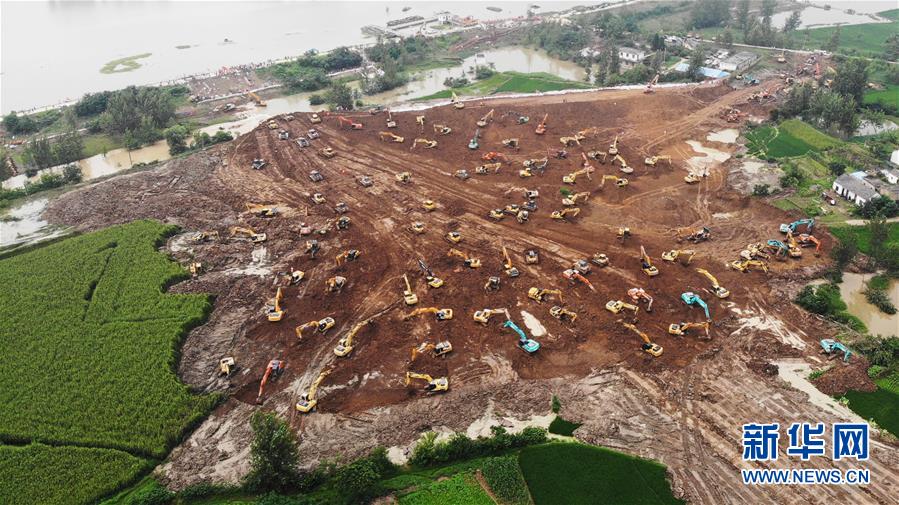 7月28日,在姜唐湖蓄洪區(qū)戴家湖一處涵閘險情處置現(xiàn)場,人們操作機械設備在搶筑臨時圩堤(無人機照片)。新華社記者黃博涵攝