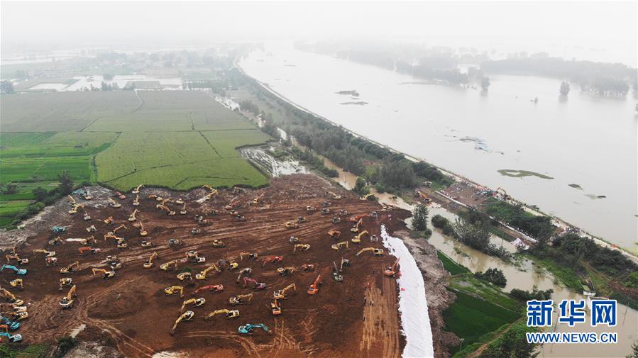 7月28日,在姜唐湖蓄洪區(qū)戴家湖一處涵閘險情處置現(xiàn)場,人們操作機械設(shè)備在搶筑臨時圩堤(無人機照片)。新華社記者黃博涵攝
