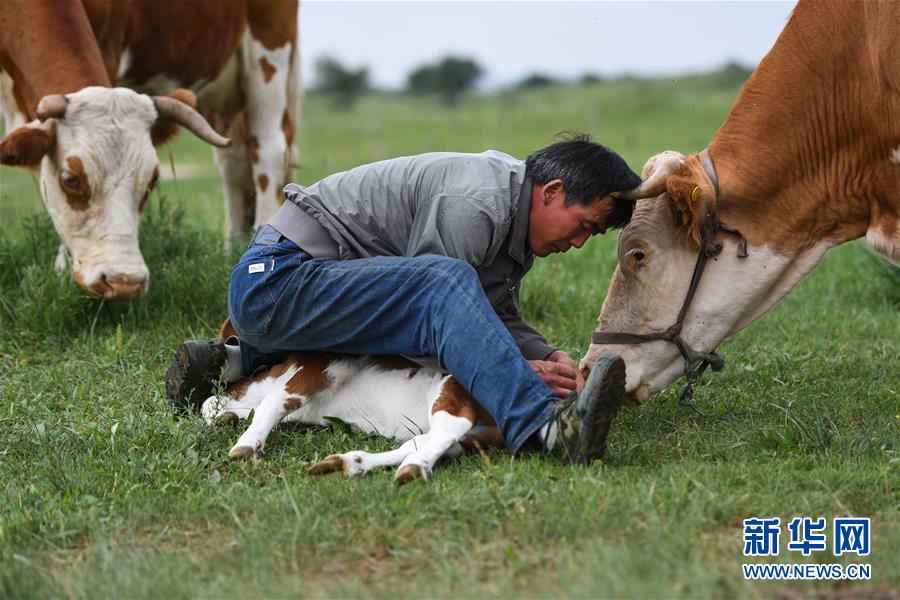 呼格吉勒在為牛犢處理傷口(7月26日攝)。新華社記者劉磊攝