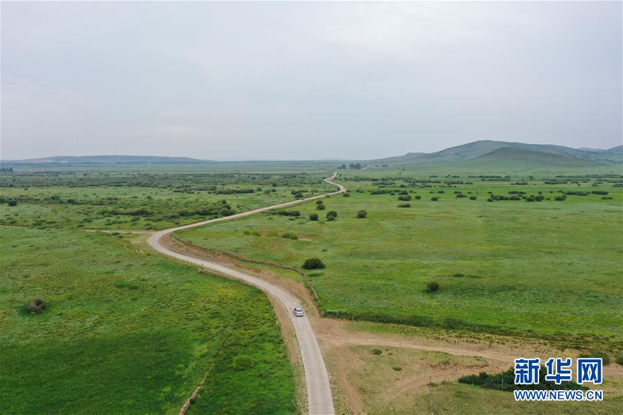 呼格吉勒和妻子薩如拉、女兒蘇日娜駕車從牧區(qū)的家前往旗里的新房(7月26日攝,無人機(jī)照片)。新華社記者徐欽攝