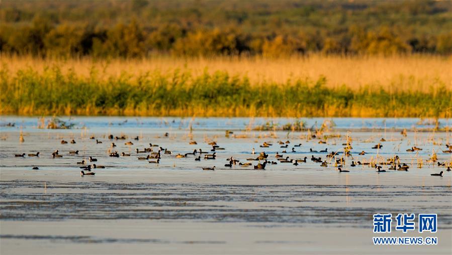7月28日,成群候鳥在桃力廟—阿拉善灣海子覓食。鄂爾多斯?jié)竦匚挥趲?kù)布齊沙漠、毛烏素沙地接壤地帶,2002年被列入國(guó)際重要濕地名錄。從2006年開始,由于濕地湖面萎縮、湖心島消失,在此筑巢繁殖的世界瀕危物種遺鷗幾近消失。近年來(lái),當(dāng)?shù)夭扇《喾N治理措施,濕地生態(tài)環(huán)境逐步好轉(zhuǎn)。2019年起,濕地內(nèi)的桃力廟—阿拉善灣海子迎來(lái)遺鷗大規(guī)模“回歸”。如今,40多種鳥類在此棲息,鄂爾多斯?jié)竦刂匦鲁蔀轼B類的樂(lè)園。新華社記者連振攝