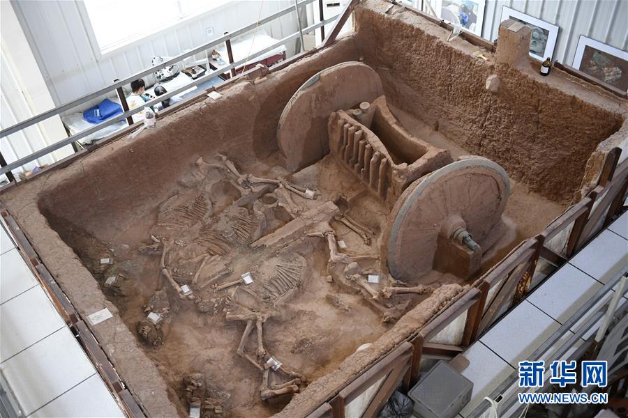 這是7月30日在陜西省考古研究院涇渭基地拍攝的西周晚期青銅輪牙馬車。經(jīng)過文物保護(hù)人員3年多連續(xù)不斷的保護(hù)修復(fù),一套總長超過3米的西周晚期青銅輪牙馬車已保護(hù)和復(fù)原完畢。這套青銅輪牙馬車2014年出土于陜西省寶雞市岐山縣周原遺址,馬車長3.13米、寬2.7米、高1.5米,車頭部位有4匹馬的遺骸。馬車車廂裝飾華麗繁復(fù),有大量鑲嵌綠松石的青銅構(gòu)件、薄壁青銅獸面裝飾以及玉器和彩繪構(gòu)件,車輪外沿全部由青銅鑄造而成,這也是目前唯一一套部件完整的青銅輪牙馬車。根據(jù)實(shí)驗(yàn)室提取的遺物和精確數(shù)據(jù),考古工作者按照原來的工藝、結(jié)構(gòu)對這輛青銅輪牙馬車進(jìn)行了同比例復(fù)原。這套青銅輪牙馬車的保護(hù)和復(fù)原,對研究西周晚期的禮儀及車輿制度有重要價(jià)值。新華社記者李一博攝