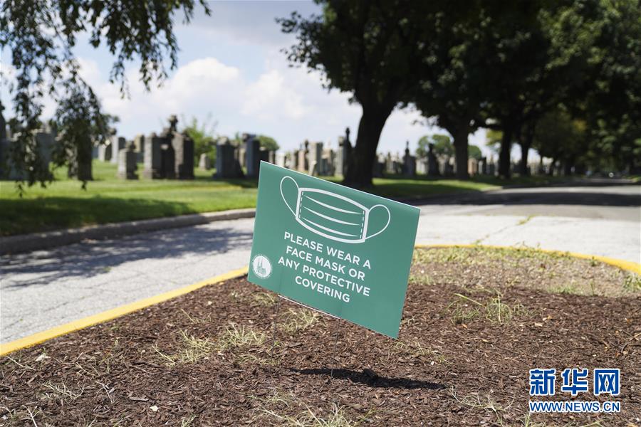 7月29日,在美國(guó)紐約一處墓地,提示牌提醒人們佩戴口罩。美國(guó)約翰斯·霍普金斯大學(xué)實(shí)時(shí)統(tǒng)計(jì)數(shù)據(jù)顯示,截至29日,美國(guó)累計(jì)新冠確診病例已超過(guò)440萬(wàn)例,累計(jì)死亡病例超過(guò)15萬(wàn)例。新華社記者王迎攝