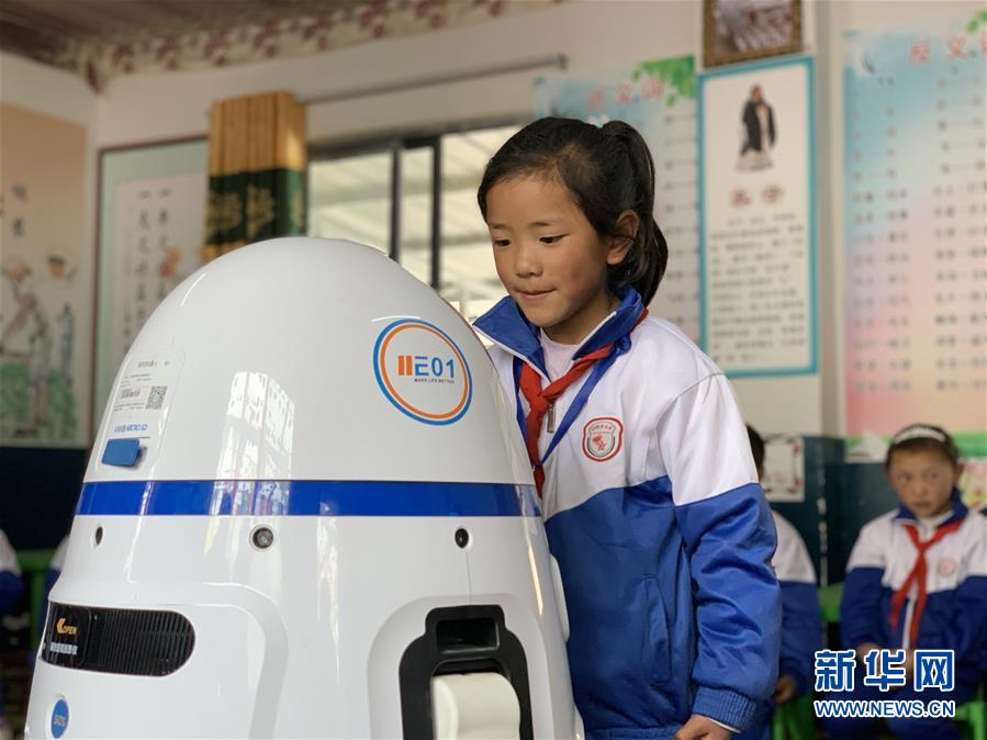拉孜鄉(xiāng)中心小學(xué)學(xué)生在與智能機(jī)器人對(duì)話(7月29日攝)。新華社記者洛卓嘉措攝