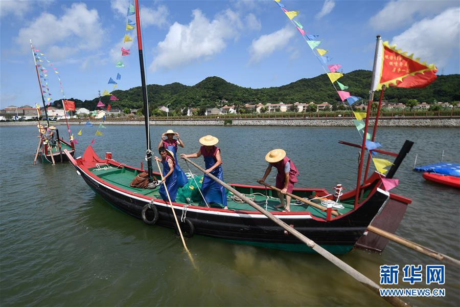 8月1日,螞蟻島居民在避風(fēng)塘漁民勞作現(xiàn)場體驗(yàn)區(qū)為游客表演木帆船捕魚。新華社記者黃宗治攝