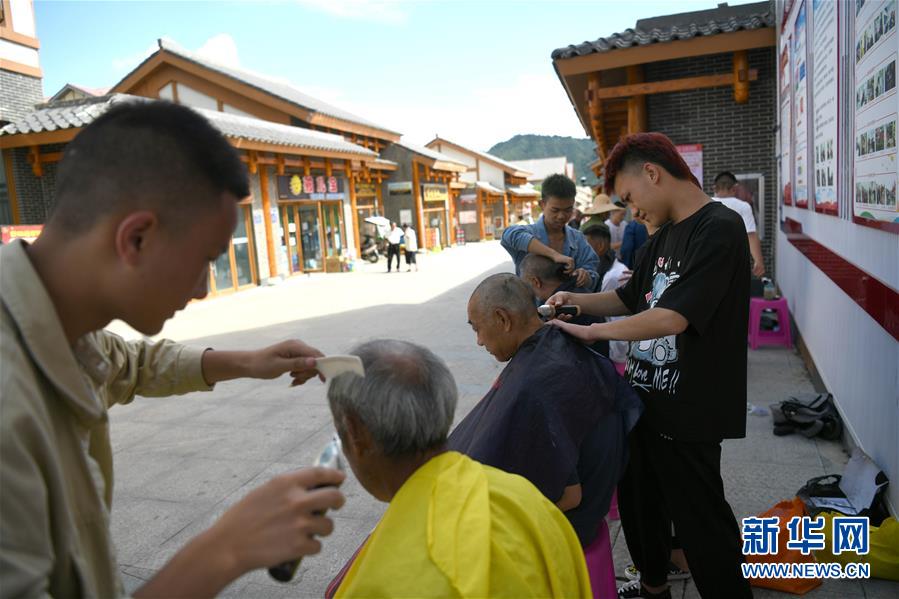 志愿者在柏楊林易地扶貧搬遷安置點為老人免費理發(fā)(8月3日攝)。貴州省畢節(jié)市七星關(guān)區(qū)柏楊林易地扶貧搬遷安置點是畢節(jié)市最大的易地扶貧搬遷安置點,總面積約1.1平方公里,從2017年開始至今,共有34個鄉(xiāng)鎮(zhèn)6372戶29001人安置到位。如今,安置點內(nèi)教育、醫(yī)療、就業(yè)扶貧車間、長幼日間托養(yǎng)照料中心等設(shè)施齊全,搬遷群眾在這里過上了安居樂業(yè)的幸福生活。新華社記者金良快攝