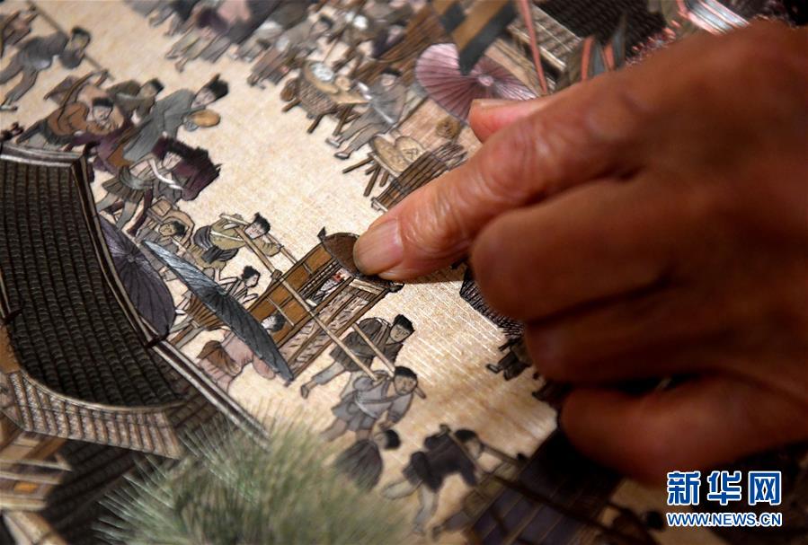 在開封市素花宋繡工藝有限公司的展示館里,王素花指出徒弟們繡品上需要修改的地方(7月30日攝)。新華社記者李嘉南攝