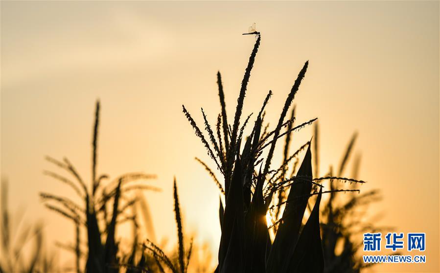 在吉林省梨樹縣國家百萬畝綠色食品原料(玉米)標(biāo)準(zhǔn)化生產(chǎn)基地核心示范區(qū),一只蜻蜓??吭谝恢暧衩咨希?月23日攝)。新華社記者許暢攝