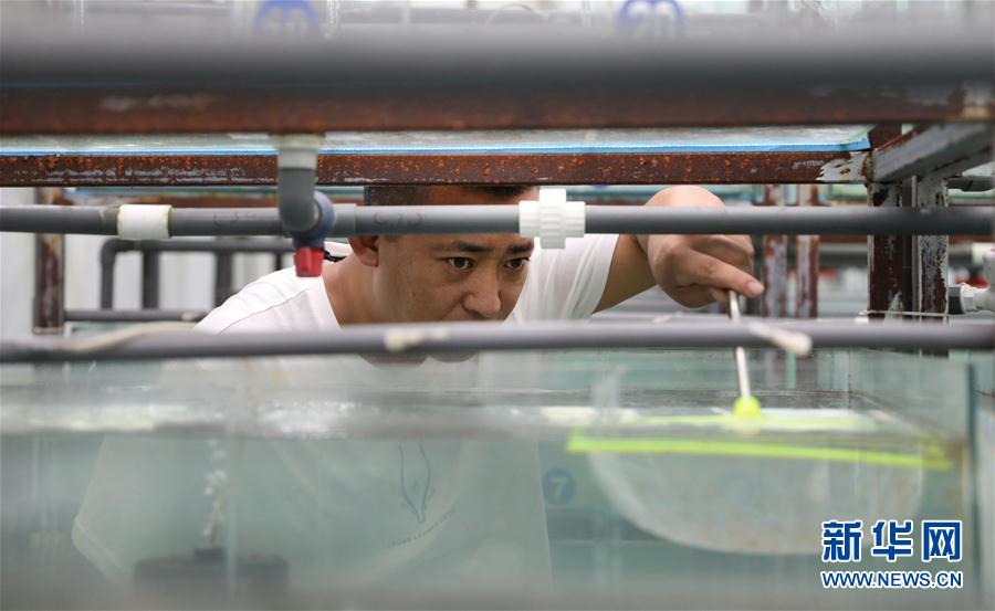 8月4日,張忠堡村村民李國(guó)鵬在觀賞魚養(yǎng)殖缸里分揀魚苗。新華社記者姚劍鋒攝