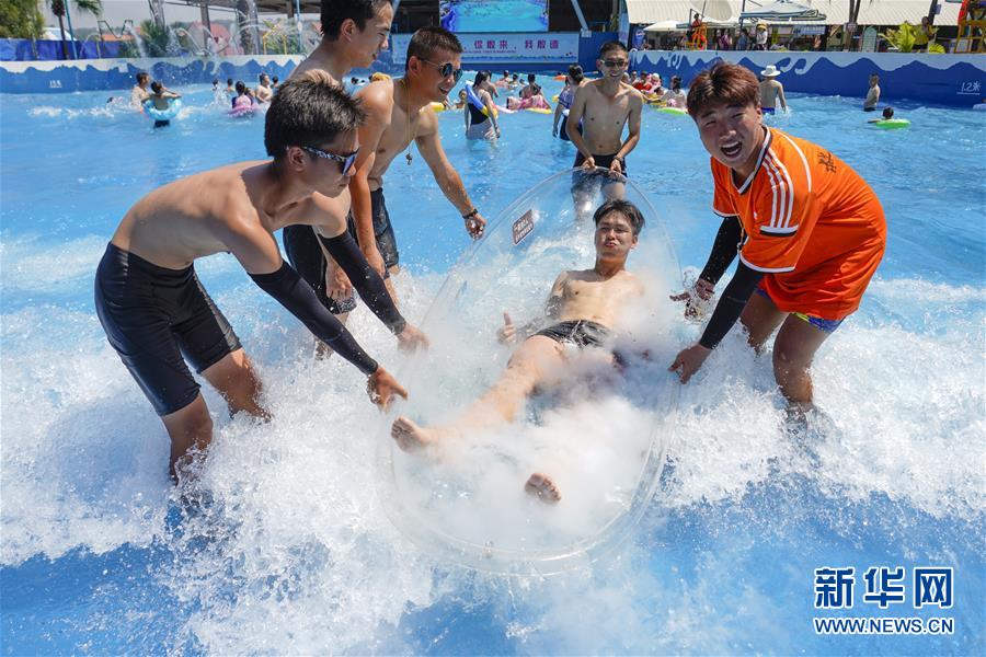 8月5日,重慶涪陵紅酒小鎮(zhèn)水上樂園內(nèi),一名游客躺在裝滿冰塊的冰船內(nèi)。當日,重慶市氣象臺再次發(fā)布“高溫橙色預(yù)警信號”,重慶大部分海拔400米以下地區(qū)日最高氣溫將升至37℃以上,局地可達40℃以上。許多重慶市民涌進當?shù)氐乃蠘穲@和泳池,在水中享受夏季的清涼。新華社記者劉潺攝