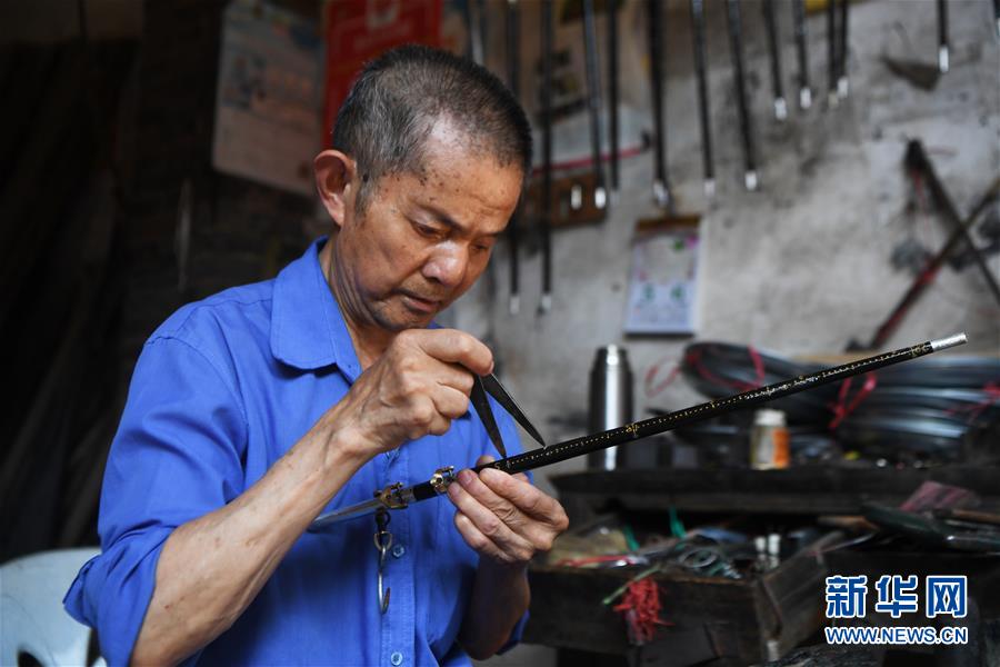 8月5日,豐盛古鎮(zhèn)經(jīng)營(yíng)秤桿店的居民王澤喜在制作秤桿。近年來,重慶市巴南區(qū)引入社會(huì)資本,按照“修舊如舊、適度開發(fā)”的原則對(duì)豐盛古鎮(zhèn)進(jìn)行保護(hù)性修繕和景區(qū)化打造,讓古鎮(zhèn)在保留原有歷史人文風(fēng)貌的同時(shí),煥發(fā)新活力。新華社記者王全超攝