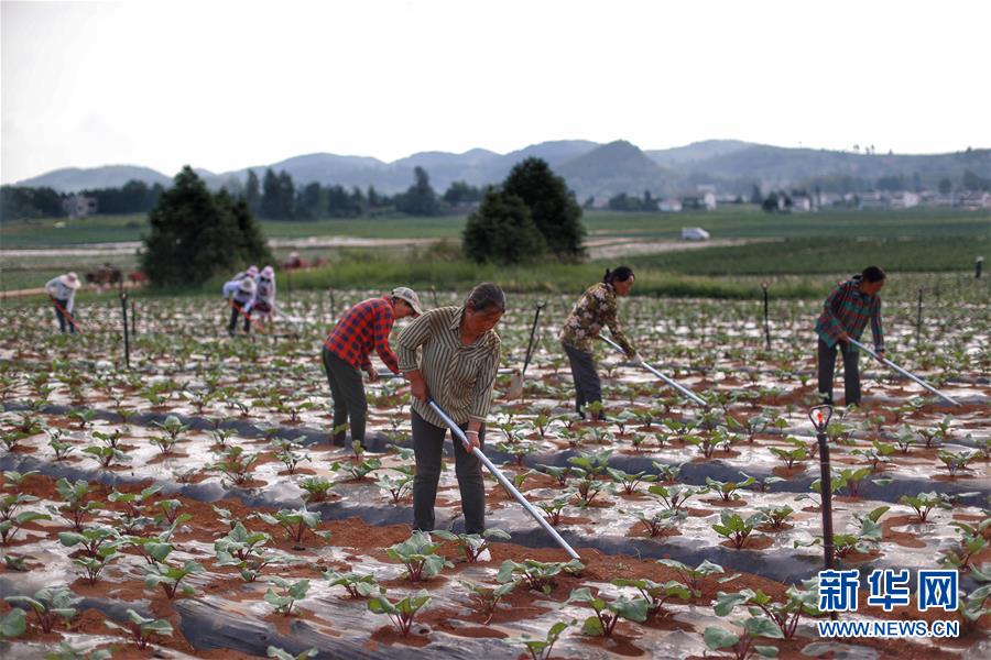8月6日,村民在威寧縣草海鎮(zhèn)中海社區(qū)蔬菜基地種植紅菜苔。新華社記者劉續(xù)攝
