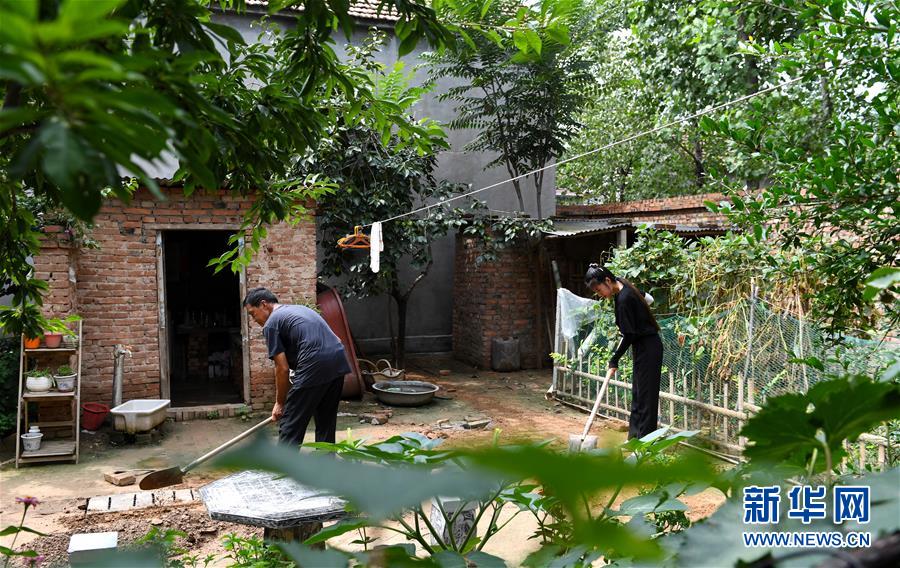 8月5日,王曉楠與父親在自家庭院內(nèi)勞作(無人機(jī)照片)。新華社記者郝源攝