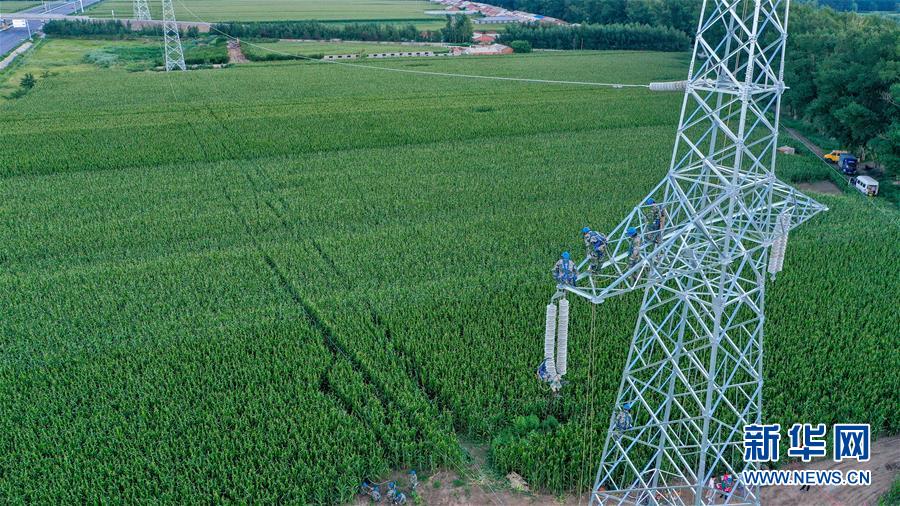 8月6日,幾名送電工在吉林省長(zhǎng)春市城郊的一處輸電鐵塔上施工作業(yè)(無(wú)人機(jī)照片)。吉林省長(zhǎng)春市連續(xù)多日出現(xiàn)高溫天氣,國(guó)網(wǎng)長(zhǎng)春供電公司輸電運(yùn)檢中心的送電工們每天清晨開始作業(yè),不畏烈日“烤”驗(yàn),堅(jiān)守工作崗位,確保工程按計(jì)劃完成。新華社記者張楠攝