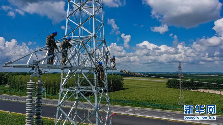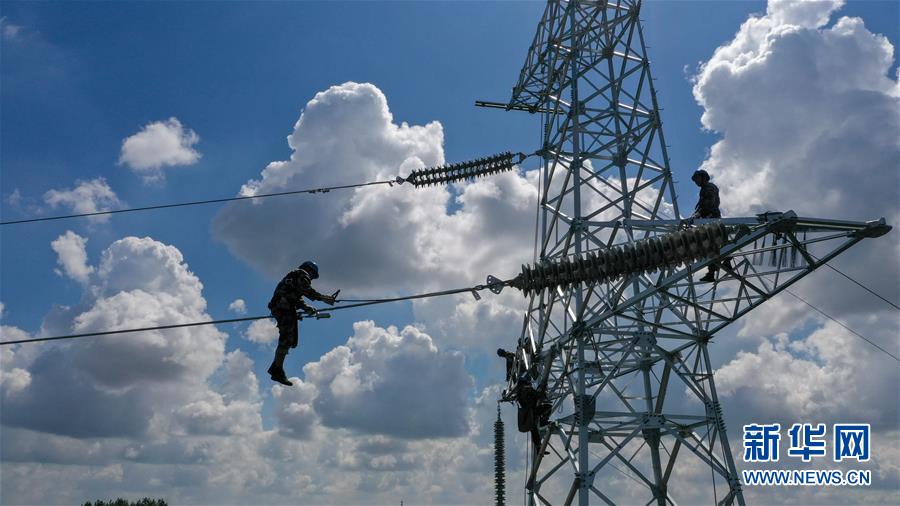 8月6日,送電工在吉林省長(zhǎng)春市城郊的一處輸電鐵塔上施工作業(yè)。吉林省長(zhǎng)春市連續(xù)多日出現(xiàn)高溫天氣,國(guó)網(wǎng)長(zhǎng)春供電公司輸電運(yùn)檢中心的送電工們每天清晨開始作業(yè),不畏烈日“烤”驗(yàn),堅(jiān)守工作崗位,確保工程按計(jì)劃完成。新華社記者張楠攝