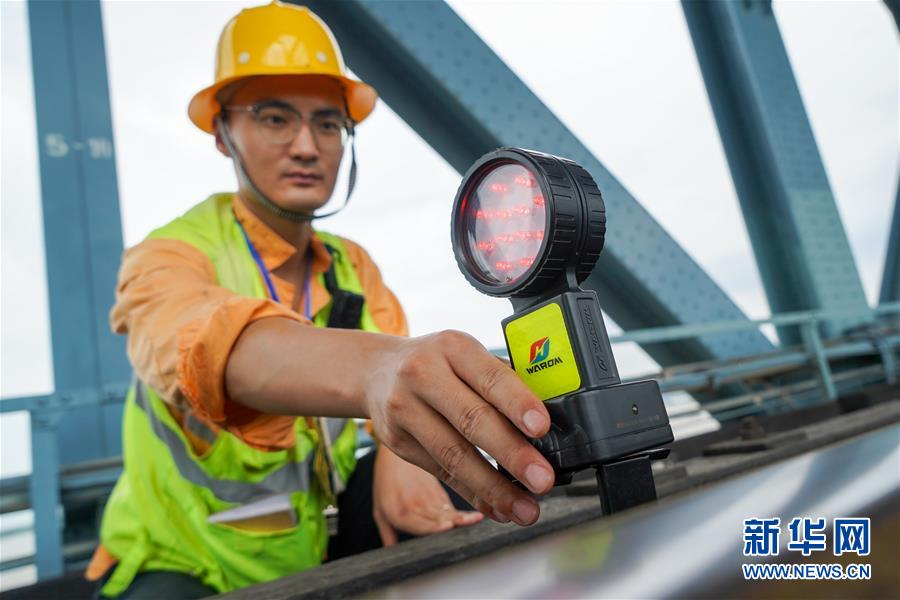 8月6日,防護(hù)員陳飛在南京長江大橋作業(yè)點安放施工作業(yè)防護(hù)燈。新華社記者李博攝