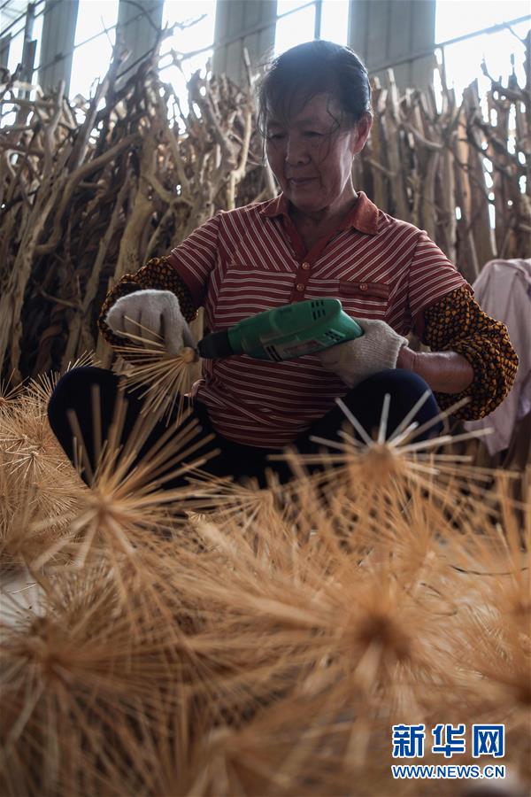 8月7日,工人利用柑橘樹枝加工吊燈飾品。2017年以來,廣西桂林市永福縣永安鄉(xiāng)通過幫扶返鄉(xiāng)青年創(chuàng)業(yè)的方式,建立起根雕工藝品就業(yè)扶貧車間,組織貧困群眾進(jìn)車間務(wù)工學(xué)藝,把當(dāng)?shù)刎S富的朽木和柑橘樹根枝資源利用起來,加工成盆景、茶桌、吊燈等根雕工藝品,不僅幫助貧困群眾在家門口掌握一技之長,還讓他們在脫貧摘帽后實(shí)現(xiàn)穩(wěn)定增收。新華社記者張愛林?jǐn)z