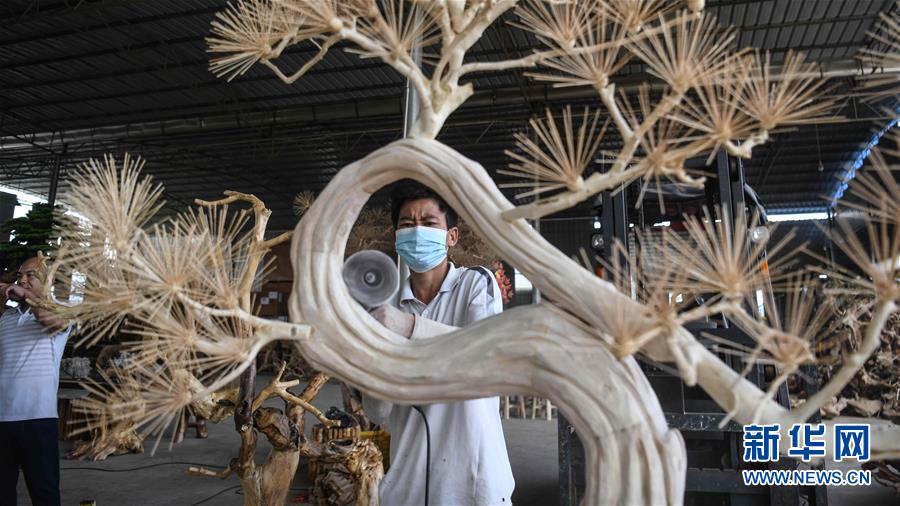 8月7日,工人在制作根雕工藝品。2017年以來(lái),廣西桂林市永??h永安鄉(xiāng)通過(guò)幫扶返鄉(xiāng)青年創(chuàng)業(yè)的方式,建立起根雕工藝品就業(yè)扶貧車間,組織貧困群眾進(jìn)車間務(wù)工學(xué)藝,把當(dāng)?shù)刎S富的朽木和柑橘樹根枝資源利用起來(lái),加工成盆景、茶桌、吊燈等根雕工藝品,不僅幫助貧困群眾在家門口掌握一技之長(zhǎng),還讓他們?cè)诿撠氄焙髮?shí)現(xiàn)穩(wěn)定增收。新華社記者張愛林?jǐn)z