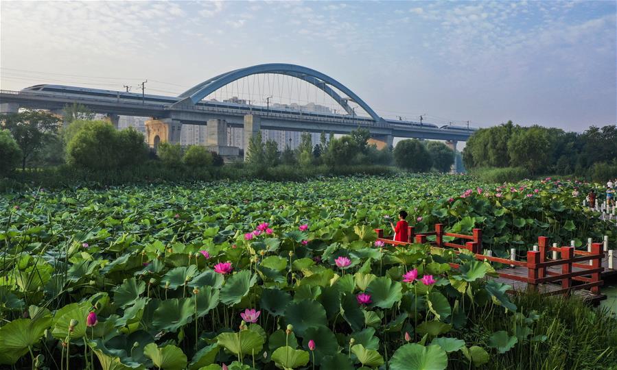 市民在唐山市豐南區(qū)人民公園欣賞荷花(7月25日攝,無人機(jī)照片)。近年來,河北省唐山市豐南區(qū)全力推動“全域治水、清水潤城”工程,形成了以唐津運河、人民公園生態(tài)廊道等以健身、休閑、旅游功能于一體的人水相親、城水相依的景觀環(huán)境,為綠色發(fā)展注入活力。新華社記者楊世堯攝。