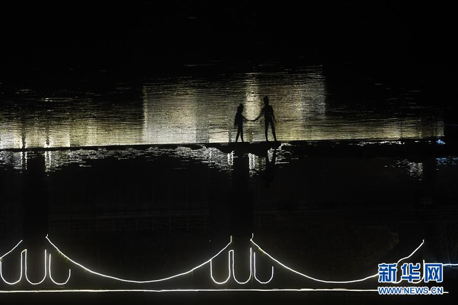 游客牽手從流經(jīng)下姜村的小河橋上走過(2017年8月9日攝)。新華社記者黃宗治攝。
