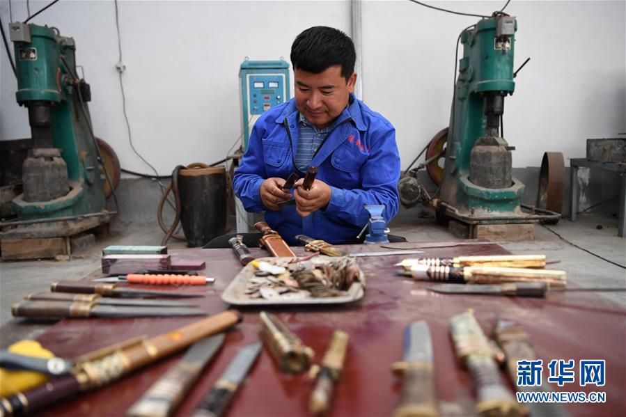 8月10日,在甘肅省臨夏回族自治州積石山縣大河家鎮(zhèn),國家級非物質(zhì)文化遺產(chǎn)代表性項目保安族腰刀鍛制技藝傳承人馬尕主麻在查看鍛制好的保安腰刀。新華社記者陳斌攝。