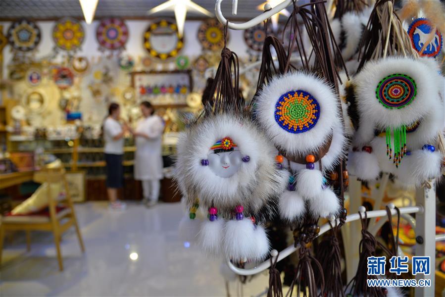 這是在內(nèi)蒙古自治區(qū)鄂溫克族自治旗巴彥托海鎮(zhèn)太陽(yáng)花傳承發(fā)展中心展示的“太陽(yáng)花”產(chǎn)品(8月7日攝)。新華社記者徐欽攝。