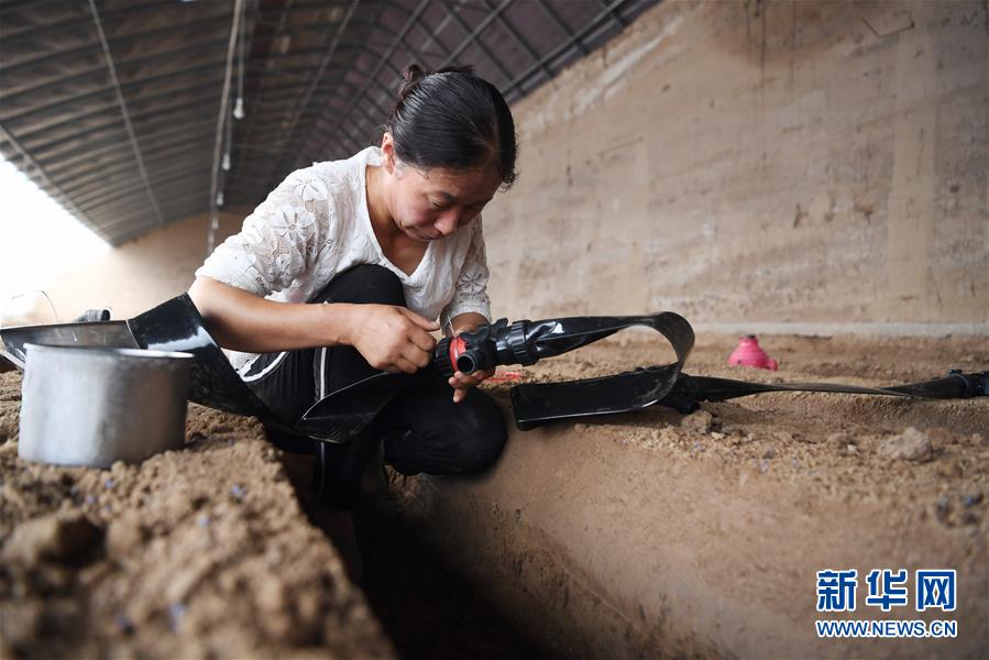8月11日,在甘肅省臨夏回族自治州臨夏縣先鋒鄉(xiāng)前韓村,搬遷戶朱懷蘭在日光溫室內勞作。近年來,甘肅省臨夏回族自治州臨夏縣把易地扶貧搬遷作為打贏脫貧攻堅戰(zhàn)的重要任務,科學推進易地扶貧搬遷和脫貧攻堅工作。為了讓搬遷群眾能夠安居樂業(yè),當?shù)卣⒅胤龀趾罄m(xù)產(chǎn)業(yè)發(fā)展,引導搬遷群眾發(fā)展日光溫室、布鞋加工、觀光農(nóng)業(yè)、特色種養(yǎng)殖等產(chǎn)業(yè),幫助搬遷群眾實現(xiàn)就近就業(yè)、拓寬增收渠道,確保搬遷群眾“搬得出、穩(wěn)得住、有事做、能致富”。新華社記者陳斌攝
