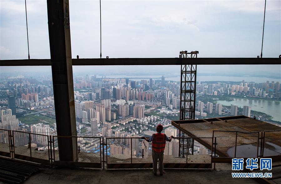 8月11日,一名工人在武漢綠地中心項目建設(shè)現(xiàn)場近500米的高空遠眺。新華社記者肖藝九攝