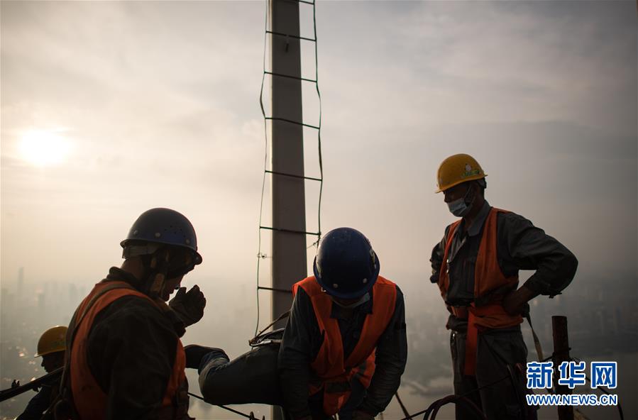 8月11日,工人在武漢綠地中心項目建設(shè)現(xiàn)場近500米的高空施工。新華社記者肖藝九攝