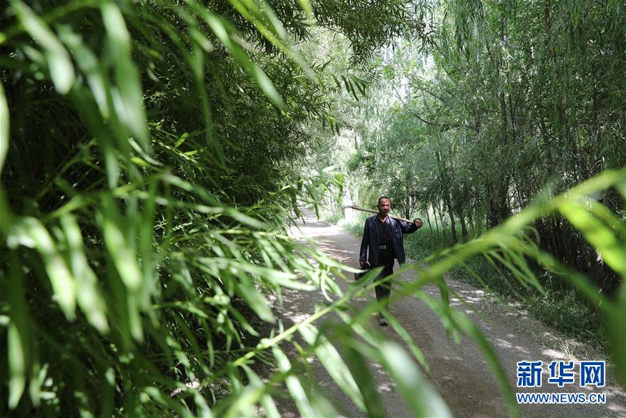 甘肅省金昌市永昌縣下四壩村村民徐文國(guó)走在林間小道上,兩旁的樹都是他15年前栽的(7月10日攝)。新華社記者 杜哲宇 攝