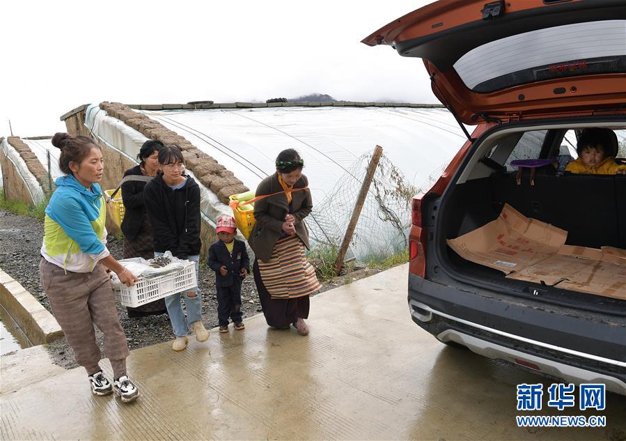 格桑旺姆(左三)和姐姐德吉卓瑪(左一)帶領(lǐng)工人將大棚出產(chǎn)的新鮮蔬菜抬上汽車(chē),準(zhǔn)備運(yùn)往店鋪銷(xiāo)售(8月3日攝)。新華社記者 李賀 攝