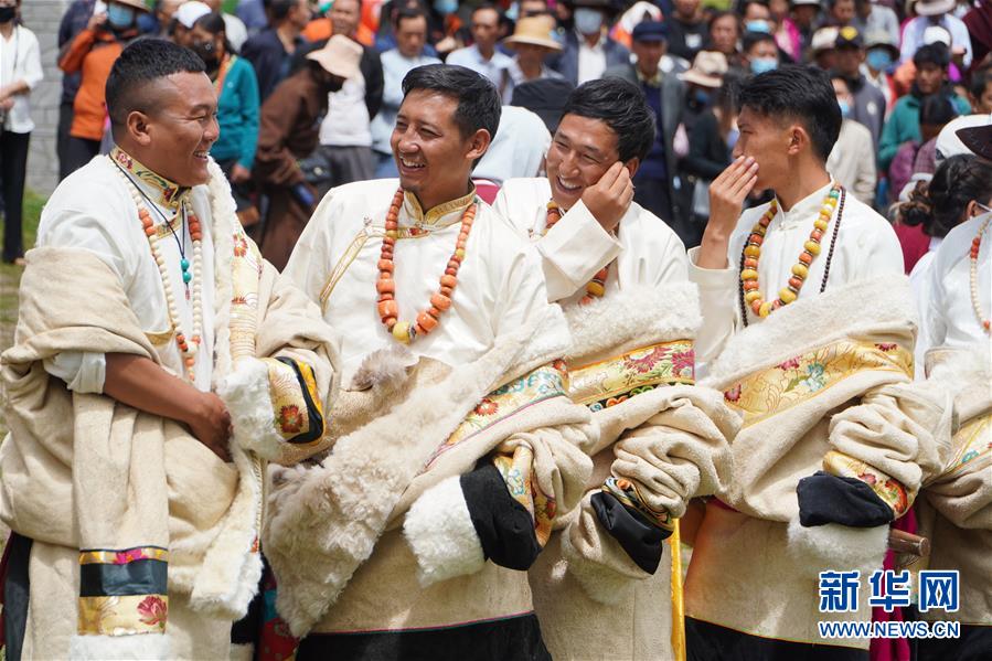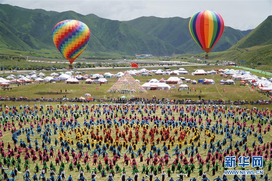 8月12日,演員在開幕式上表演舞蹈。當日,2020中國碌曲鍋莊舞展演暨甘南藏族自治州第六屆少數(shù)民族傳統(tǒng)體育運動會在甘肅省甘南州碌曲縣夏澤灘草原上舉行。開幕式上,三千余名身著節(jié)日盛裝的演員和當?shù)厝罕娫诓菰掀鹞瑁旰蟪跚绲牟菰铣錆M歡聲笑語。新華社記者 耿馨寧 攝