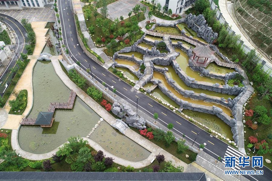 鎮(zhèn)安縣鎮(zhèn)安中學(xué)多級瀑布群與水池棧道涼亭景觀(7月30日攝,無人機(jī)照片)。新華社記者邵瑞攝