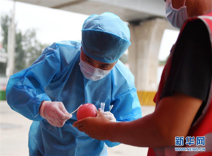 工作人員在新發(fā)地批發(fā)市場周轉新區(qū)對進場車輛進行取樣(8月6日攝)。 新華社記者 張晨霖 攝