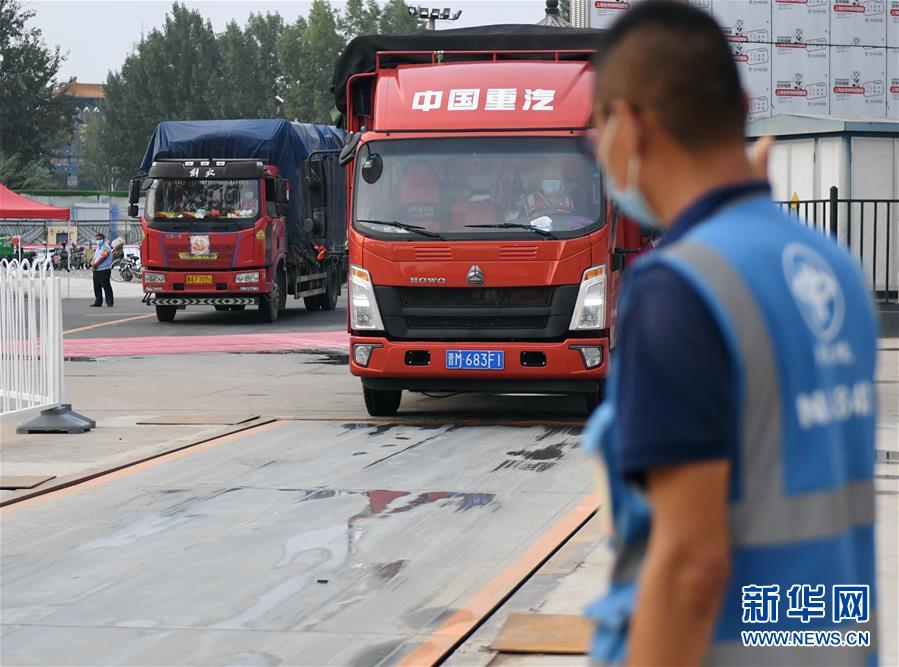 進場車輛進入新發(fā)地批發(fā)市場周轉新區(qū)(8月6日攝)。 新華社記者 張晨霖 攝